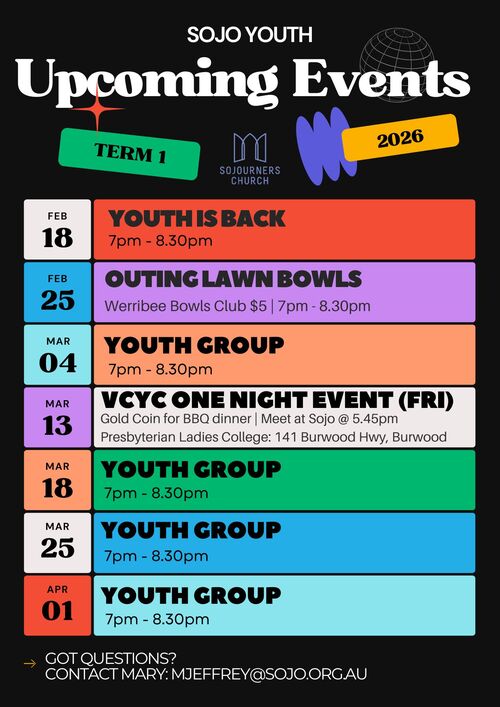 Sojo Youth runs on Wednesday evenings during the school term. We kick things off at 7pm, with games and time together exploring what it means to follow Jesus and live as His people. There will be supper provided.